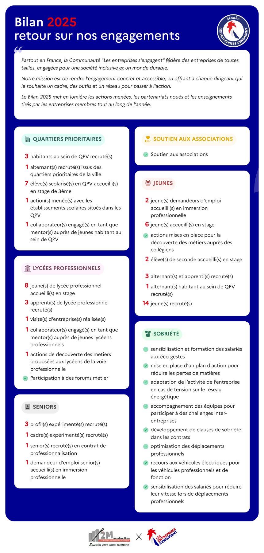 À travers ces remerciements, 2M Construction souhaite également saluer le rôle de France Travail et des Missions Locales, dans la mise en œuvre des politiques publiques de l’emploi, au service des entreprises et des publics, contribuant ainsi pleinement à la dynamique RSE portée par l’État et ses partenaires.